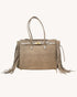 Borsa a spalla scamosciata con dettagli in pelle e frange laterali, chiusura con zip, interno con unico scomparto con taschino interno anch'esso con zip.
